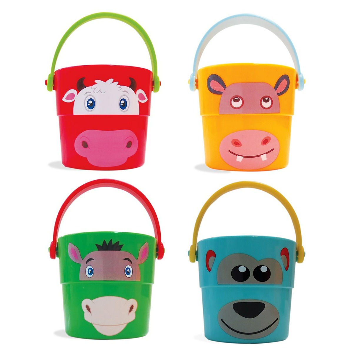 Hov. De 4 spande er ikke helt normale spande, som vi kender dem fra leg med sand på legepladsen.Hæld vand i spandene og opdag, hvordan det løber ud igen i forskellige mønstre i bundens aflange og runde huller. Dit barn kan selv opdage, hvordan spandene virker, hvad man kan hælde i dem, og finde ud af, at de også kan stables.Mens dit barn eksperimenterer, lærer det om, hvordan vand nemt flyder gennem hullerne, mens det er lidt sværere, hvis I rykker ud i sandkassen og leger med fint sand. Helt umuligt bliver det at få vådt og tungt sand til at løbe gennem spandende. Et spændende mysterium for den 1-2 årige. De fire spande er oplagte til leg i badekarret, hvor mange forældre oplever, at børnene nægter at ville i bad. Så er det helt ok at fylde badetiden med sjov og læring og springe shampooen over. Spandene er nemme at gøre rene efter brug. Dermed er de oplagte, hvis du helt vil undgå risiko for mugdannelse i badelegetøjet.