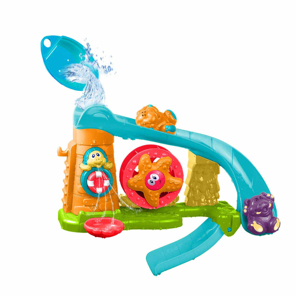 Hov, det løber, plasker, drypper og gør mig bare så glad.Dit barns bad bliver lige en hel del længere med dette sjove legeland, som har en masse legemuligheder. Her er både rutchebane, karrusel, sprøjtende skildpadde og to figurer, der kan lege med.