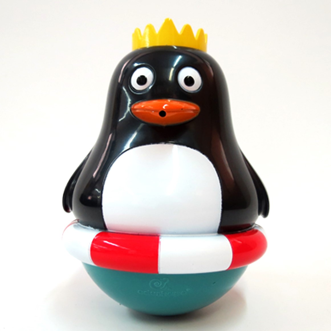 Pingvinen her kan både bruges som badelegetøj og som en tumling, der ikke kan vælte.På gulvet kan pingvinen gynge og vippe, som om den var levende. Det giver dit barn lyst til at gribe fat i den, og på den måde arbejder både grovmotorikken og finmotorikken på én og samme tid.Sæt den fx foran baby, som ligger på maven og træner nakken ved at holde hovedet løftet. Øvelsen er meget sjovere med et sjovt og vippende legetøj at kigge på.I badekarret kan dit barn fylde pingvinen med vand og se, hvordan den frækt sprøjter vandet ud af næbbet igen. Det styrker dit barns muskel-ledsans, logiske tænkning og forståelse for årsag-virkning. Måske kan pingvinen sprøjte lidt på dit barns arme, ryg eller mave. Det giver en sjov og taktil sanseleg. Prøv også, om I kan få pingvinen til at snurre rundt i vandet. Og prøv at dykke den og mærk og se, hvordan opdriften løfter pingvinen op over vandoverfladen igen.Sørg for at skylle pingvinen med koldt vand, tømme den og sætte den til tørre efter leg i badekarret, soppebassinet eller håndvasken.