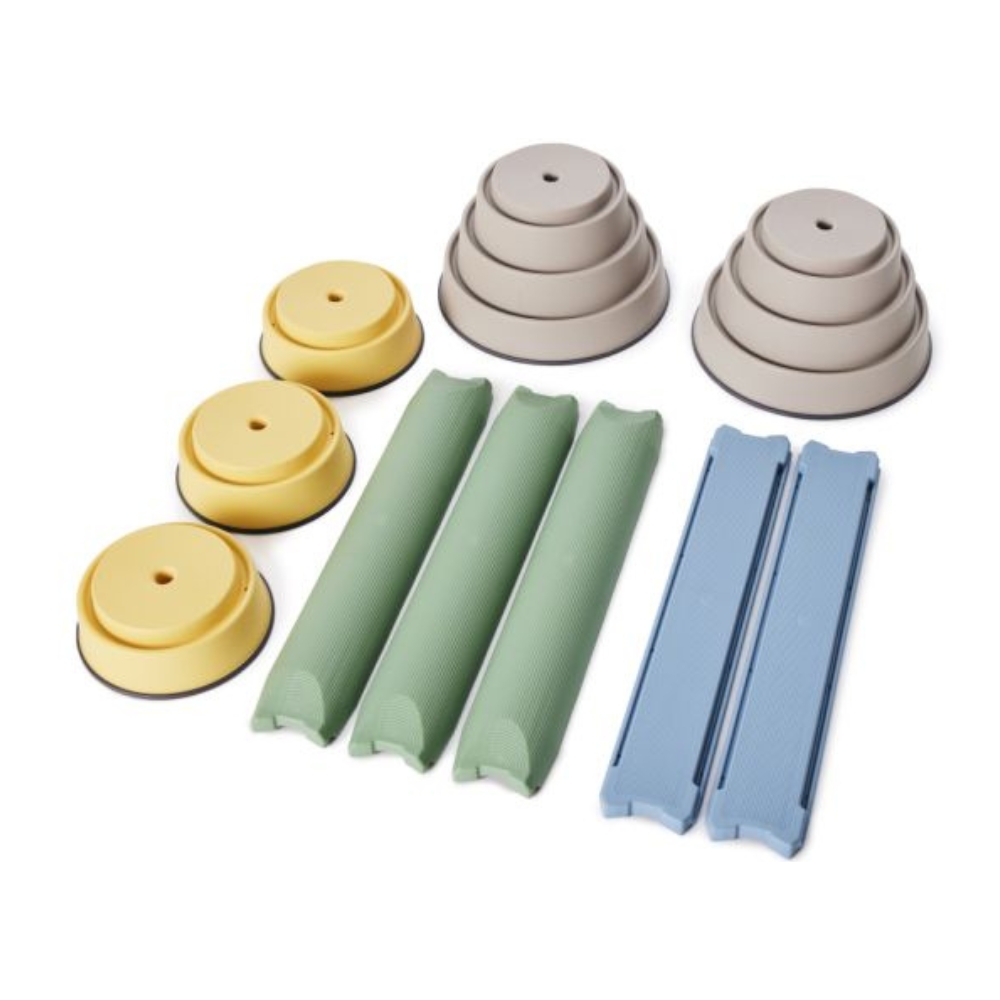Sej balancebane i flere højder og dæmpede farver, så vi bedre kan leve med, at stuen i dagevis er blevet stedet for jorden-er-giftig leg eller leg med at prøve at vælte hinanden ned fra banen.2 grå toppe (24 cm høje)3 lysegule toppe (10 cm høje).2 lyseblå balanceplanker (72 cm lange)3 lysegrønne planker (72 cm lange).