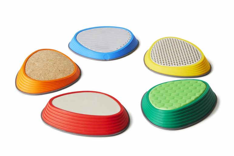 5 Gonge River Stones med forskellige taktile overflader:Aluminium, cement, kork, gummi og skum.Mærk hvordan de forskellige materialer giver helt forskellige sanseindtryk. Nogle virker hårde mens andre er mere bløde. Nogle er kølige og andre føles lunere. Prøv at placere stenene med passende mellemrum, og så skal børnene hoppe fra sten til sten uden at falde ned. River Stone har gummidutter i bunden, så de ikke glider og samtidig beskytter gulvet.Det styrker labyrintsansen, og det kan være en god træning til børn, der er utrygge ved højde.