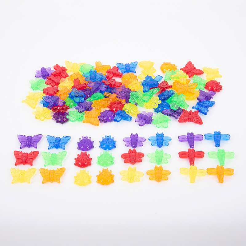 Her er mariehøner, sølvsmede, bier og sommerfugle i 6 forskellige farver, som dit barn kan hygge sig med at tælle med, lave regnestykker med, sortere og rumstere rundt med. De er flotte at bruge med et lysbord eller lyspanel, men de er også dejlige at lege med uden. Insekterne kan gemme sig efter legen i den medfølgende bøtte.