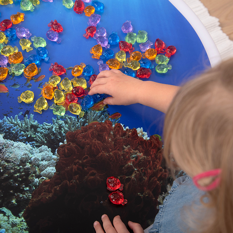 tickitŪ - Fisk - Transparente, 120 stk. Er velegnet til Form- og farvegenkendelse,Kognitive færdigheder,Tal- og mængdeforståelse og passer til aldersgrupperne: 3 år,4 år,5 år,6 år,7 år