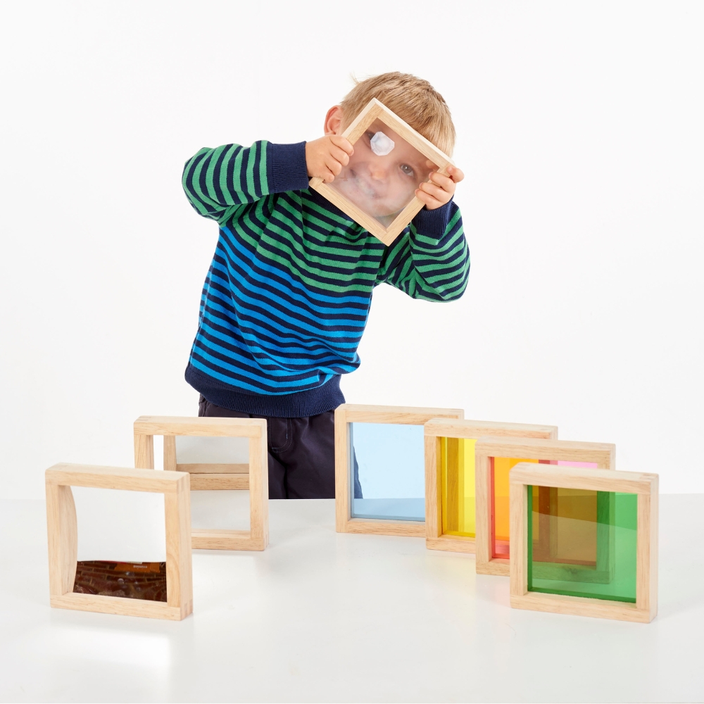 Både brandbiler, sutter og hænder skifter nærmest personlighed, når man ser på dem gennem disse fine sansekvadrater. Her er 4 transparente flader, et konkavt spejl, et konvekst spejl og et almindeligt spejl.