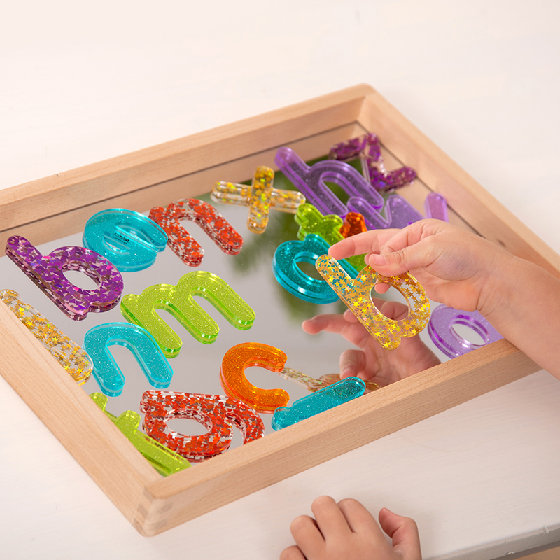 Både biler, te-stel og dyrefigurer bliver til noget helt nyt, når legen foregår på et stort spejl. Prøv også at lade dit barn lave kreative projekter som fx perlekæder på spejlet. Det er fremstillet af akryl, så det ikke kan knuses så let. Selve bakken er af bøgetræ.