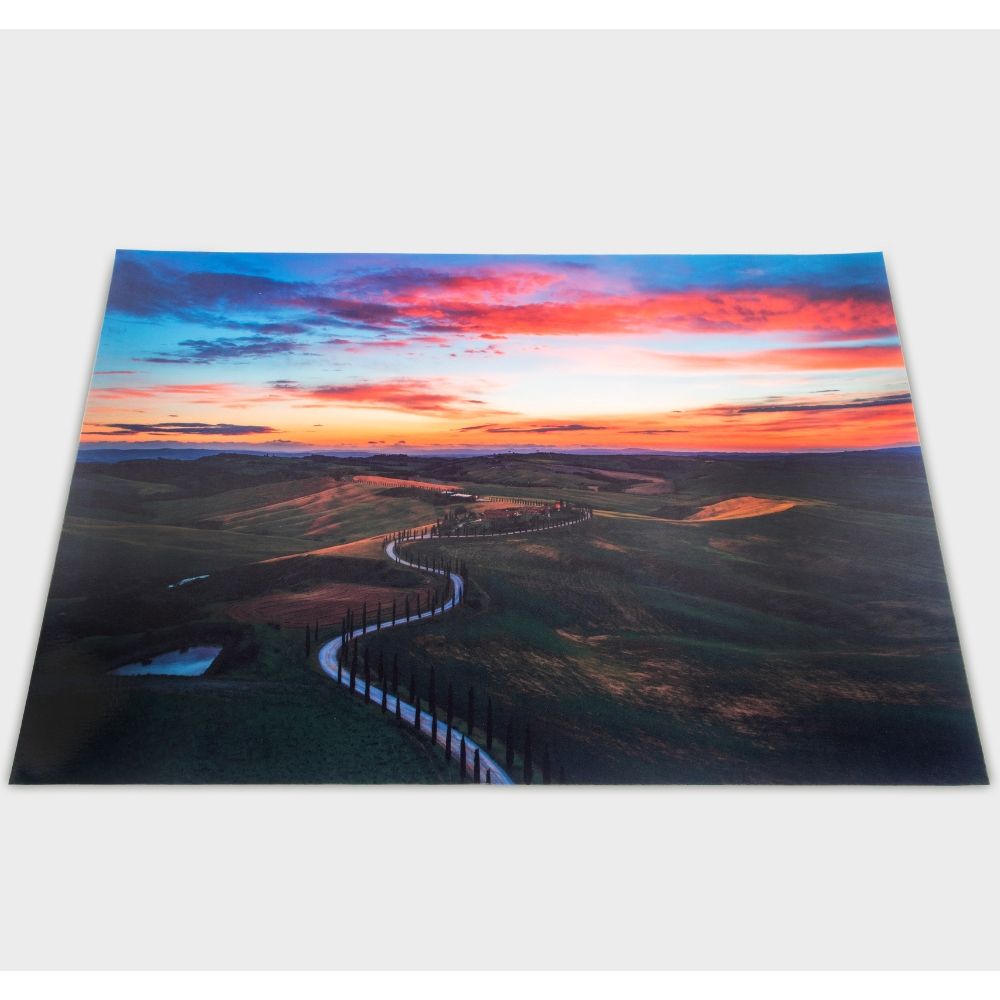 Meget smuk baggrund for dit barns legefigurer, som bliver endnu mere eventyrlig på en lyskilde såsom et lysbord. Legemåtten er halv gennemsigtig, så når lyset trænger igennem, bliver den bugtende vej på landet endnu flottere.Måtten er af polyester, så den er nem at tørre af.