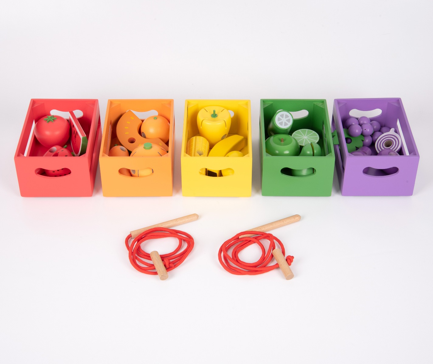 Her er sættet, hvor dit barn kan farvesortere frugt og grønt, tælle (der er 20 frugter og grøntsager i alt) eller fylde legekøkkenet og invitere dukkerne eller dig på smoothie. Snak om farverne og hvordan de tiltaler os og påvirker os på forskellige måder. Brug dem i matematiske tællelege, hvor dit barn træner sin mængdeforståelse.Oplagte at bruge til Montessori inspireret leg, hvor dit barn leger sig klogere gennem fri leg under faste rammer og brug af fantasien. Sæt brikkerne frem og se, hvilke lege det bringer med sig.Mon dit barn lynhurtigt opdager, at man kan trække de små brikker på snoren? Eller er det mere spændende at tælle dem eller beslutte, hvilke af frugterne der smager bedst eller som dit barn ikke kan huske navnet på. Måske starter der straks en leg om, at dit barn får kasser med frugt og grønt leveret til døren.Måske ser dit barn helt andre legemuligheder i de forskellige figurer, end du selv havde overvejet. Det er næsten hele fidusen med Montessori-inspireret pædagogik: At tilbyde nogle rammer, som dit barn derefter kan lege frit inden for. Du kan læse mere om Montessori, og hvad det lige går ud på, i blogindlægget her.