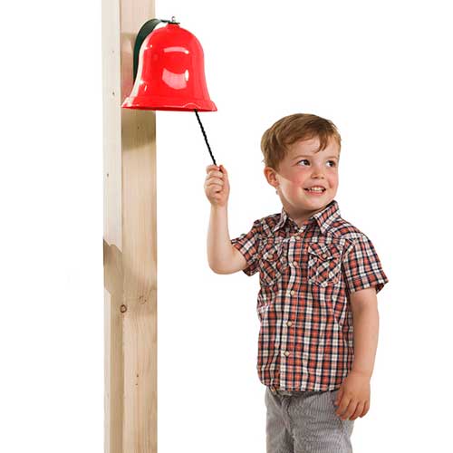 Fin klokke, der kan bruges i et hav af lege.Ding ding ding - det brænderDing ding ding - så skal vi spiseDing ding ding - du er fundet (gemmelege)Ding ding ding - så dykker ubådenFormstøbt i PP-plast med metalindsats. Selve den røde overdel er altså af plast, og det, der giver lyden, er en lille metalklokke indeni. Lyden er en klokkelyd, men den er ikke ret høj og dermed god til børns leg, når lyden helst ikke skal kunne høres i hele nabolaget. Det er ikke en samlingsklokke, der kan høres på hele legepladsen.Mål: Selve klokken er 17,5 x 17,5, på ophænget vil den hænge 23,5 cm ud fra væggenKlokkesnoren er 51 cm, hænger 33,5 cm ud under klokken, med svejset plasthåndtag for bedre greb og for at enden på rebet ikke flosser.Der medfølger 2 skruer til montering - 4 x 40mmFarve: rød, med sort reb