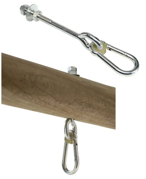 Gyngekrog i galvaniseret stål, som monteres ved at krogen går igennem stolpen.Selve gyngeleddet er belagt med nylon for at undgå friktion og metalspænder.Mål: 160mm fra top af stand ned til øjet, 80mm fra gevind til øje - passer til bjælke/stope med tykkelse fra 90-140mm.Stangen, der går gennem stolpen, er 1 cm i diameter.Kan bære op til 70 kg pr krog, dvs ialt 140 kg, hvis gyngen hænges op i to kroge.Antal: 1 stk - til mange gynger skal der bruges to.