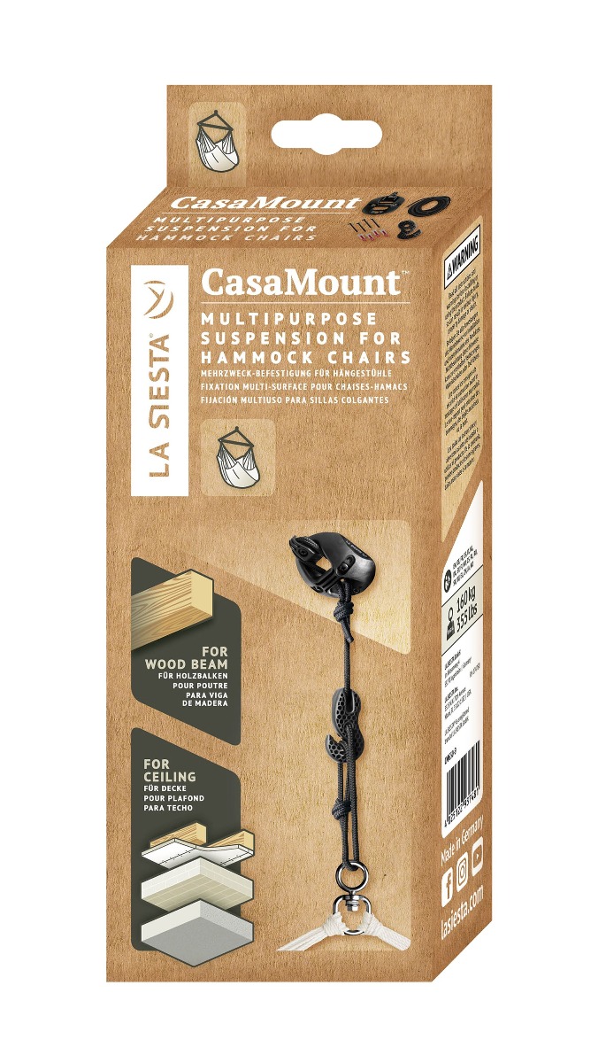 Komplet sæt til at montere hængekøjestol og hængekøjehule i vægge og lofter. Her er det hele, I skal dog selv være gode til at bore huller i væggen eller loftet. Sørg også for, at væggen eller loftet kan bære belastningen. Beslag til at skrue ind i væg eller loft måler 10,8 x 8,7 6,4 cm skruer og rawplugs, der passer til 300 cm reb, Ø7 mm Patenteret SmartHook, der gør det nemt at sætte hængekøjen op og tage den ned igen Beslag i glasfiber, som er meget stærkt Ultra vejrresistent Passer til alle La Siesta hængekøjer Bæreevne: 160 kg.