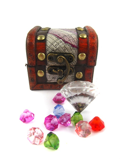 Lækker, lille skattekiste fuld af smukke diamanter og ædle stene, som vil gøre enhver pirat grøn i hovedet af misundelse. Kisten måler 6x7 cm. Fantastisk til skattejagt eller til at lege sørøvere, pirater, prinsesser og meget mere. 1 stor diamant og ca 30 små.