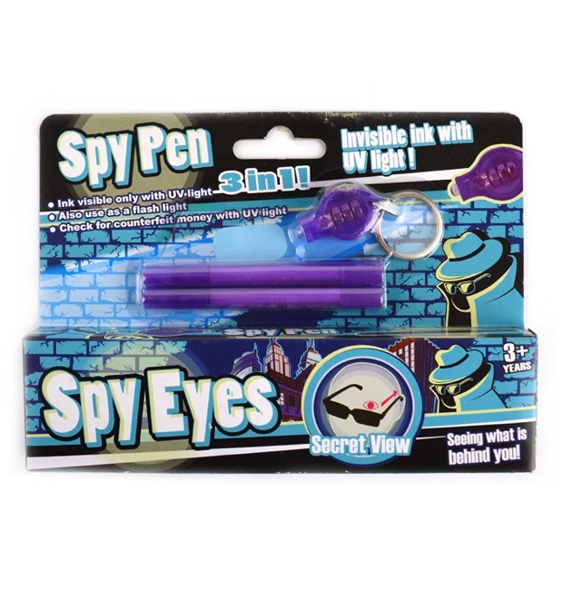 Har dit barn startet en hemmelig spionforretning eller detektivklub? Eller elsker dit barn bare at følge med i alt, hvad der foregår, for ikke at gå glip af noget som helst? Så er et par spionbriller med spejl i siderne en perfekt lille gave, som giver dit barn øjne i nakken og et cool look. Med i sættet får I også pen med usynlig blæk, som bliver afsløret, når dit barn lyser på teksten med uv-lyset.Herligt til fastelavnsfesten, til udklædningskassen, når I øver moonwalk eller leger, at I opklarer forbrydelser.