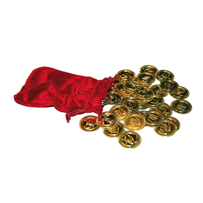 En flot bunke guldpenge i en fin pose, som gør piratlegen til noget helt særligt. Hvem vil ikke gerne have fat i skatten?36 guldpenge er der her, og de kan også bruges til skattejagten - måske krydret med en slikpose til de sukkerkolde sørøvere.