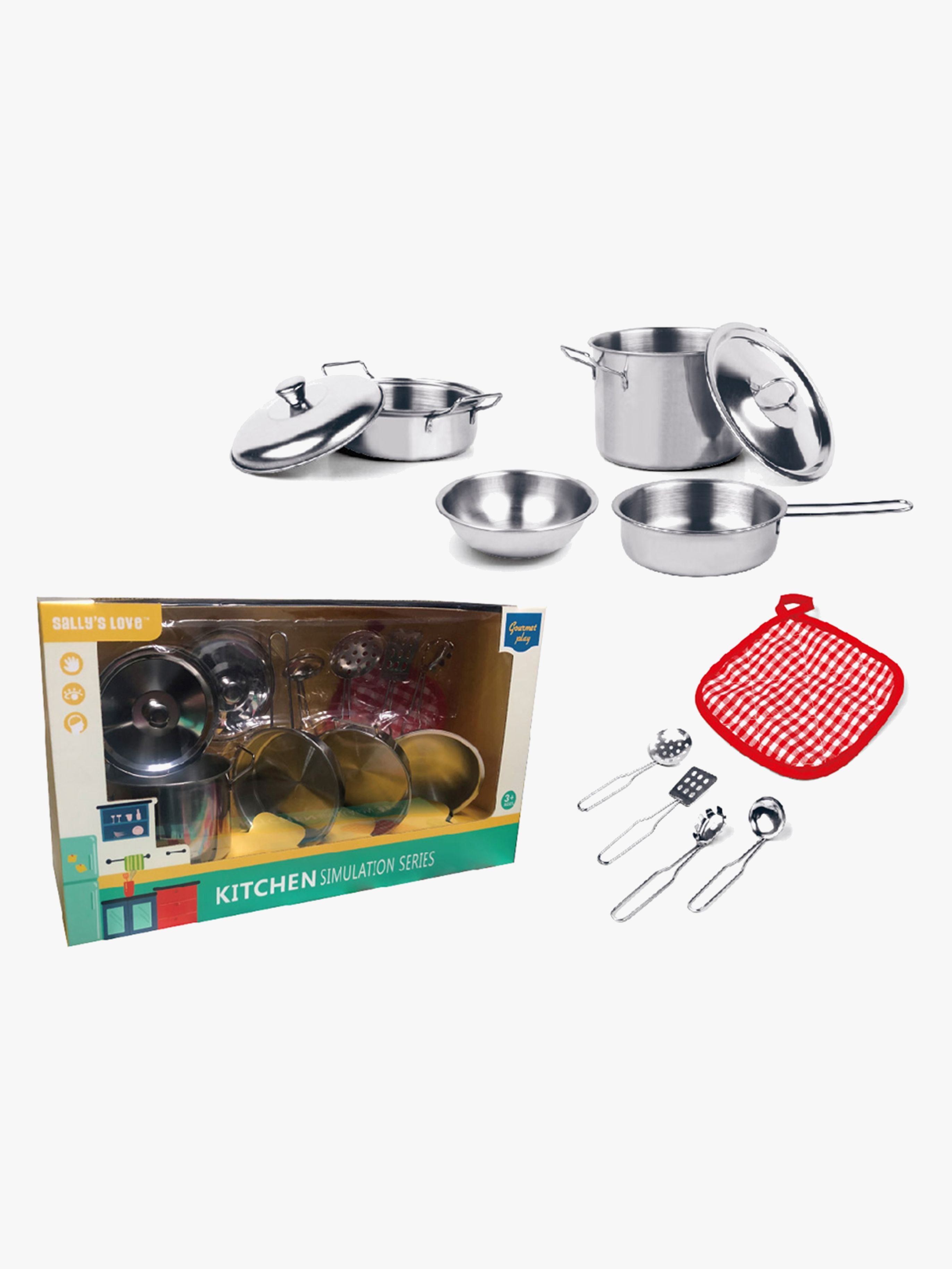 Køkkenredskabssæt fra Cloudberry Castle med 11 dele i rustfrit stål. Perfekt til timevis af fantasifuld leg. - Indeholder: 2 gryder med låg, 1 kasserolle, 1 skål, 4 redskaber, 1 grydelap. - Til sjov og fantasifuld rolleleg. - CE-mærket. - Anbefalet alder: Fra 3 år. - Rustfrit stål.