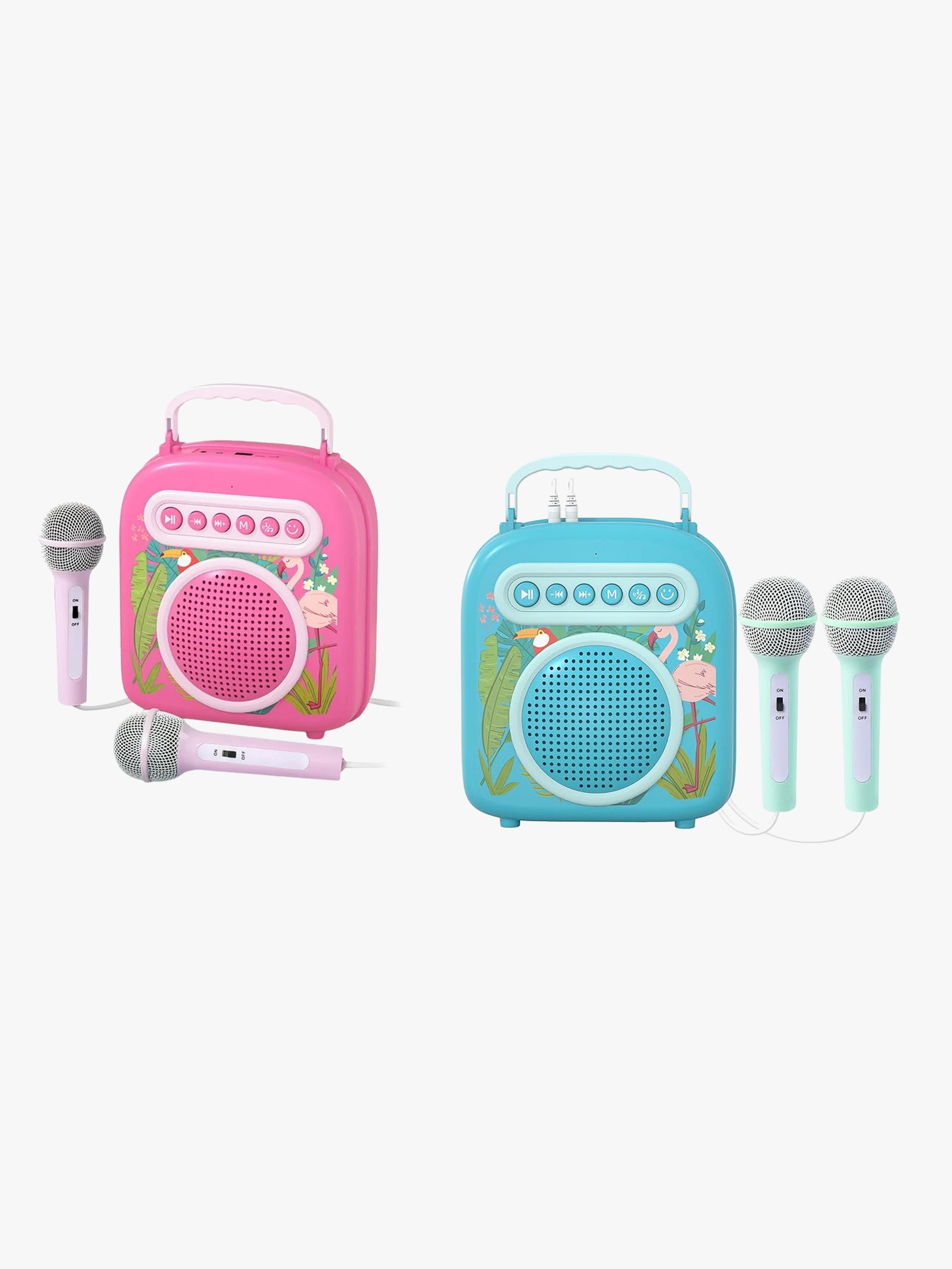 Karaokemaskine fra Cloudberry Castle med et sjovt design. Den har to medfølgende mikrofoner. Perfekt til mange timers kreativ leg. - Indeholder: 1 karaokemaskine, 2 mikrofoner. - Højttaler: 20×27 cm. - Mikrofon: 5,5×16 cm. - Perfekt til alle musikelskere. - Sødt og sjovt design. - Produktet sælges i assorterede farver. Du får et af produkterne, som er vist på billedet. - CE-mærket. - Anbefalet alder: Fra 3 år. - PP-plastik. - Batterier medfølger.