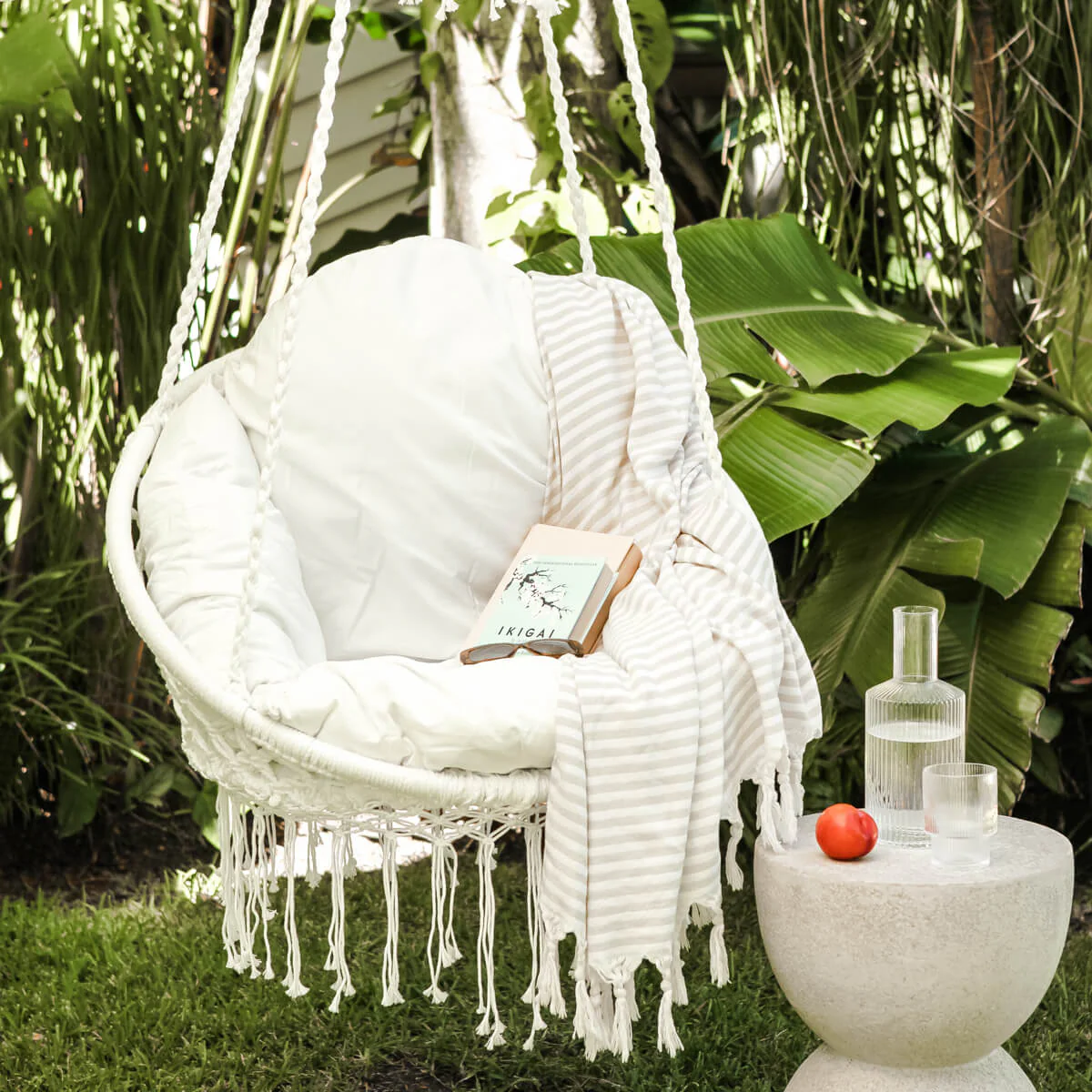 Giv dit hjem et elegant og afslappet præg med VIVERE hængestolen med frynser. Denne unikke hængekøjestol tilbyder en perfekt kombination af komfort og stil, hvilket gør den til det ideelle valg for enhver, der ønsker at skabe et hyggeligt hjørne i deres hjem.