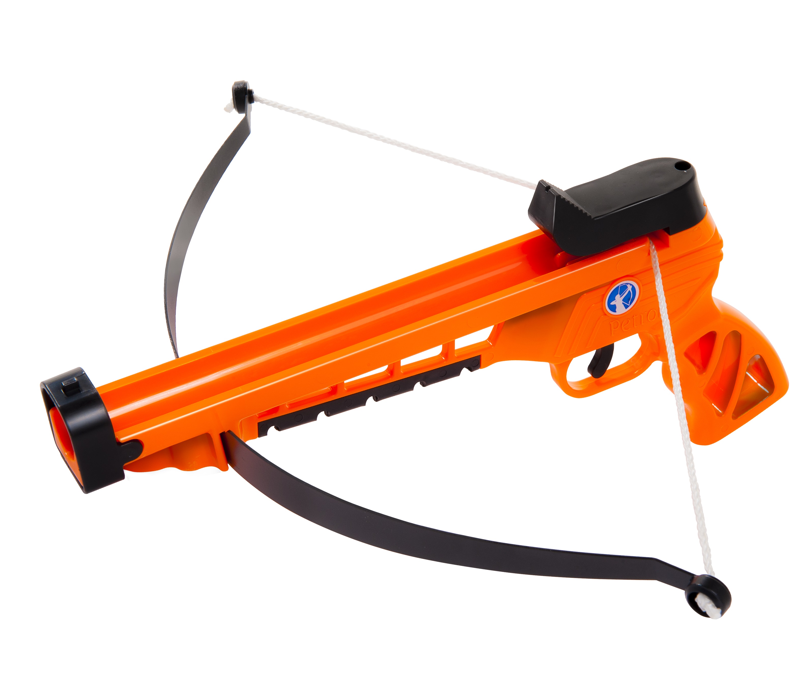 Det er en rigtig håndbue, men den skyder sikre dartpile med sugekop. Denne håndbue er bemærkelsesværdigt nøjagtige. Det er lavet af meget kraftig plast med en fjeder af stål, og lige velegnet til at skyde både indendørs og udendørs. Leveres med tre dartpi