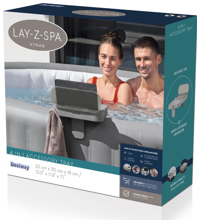 Med Lay-Z-Spa® 4-i-1-tilbehørsbakken kan du opbevare alt dit yndlingstilbehør til spabadet på ét nemt tilgængeligt sted! Med et bord, et vandtæt opbevaringsrum, håndklædebøjler og en tabletholder kan du læne dig tilbage og slappe af med alt, hvad du har b