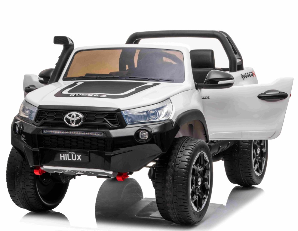 Stor og robust Toyota Hilux pickup truck med 2 x 24V motor og plads til to børn! Smukke features såsom at bagmæk, motorrum og døre kan åbnes og lukkes. LED-Lys. De kraftige 24V 240W motorer giver super træk på baghjulene, og gør den yderst terrængående, s
