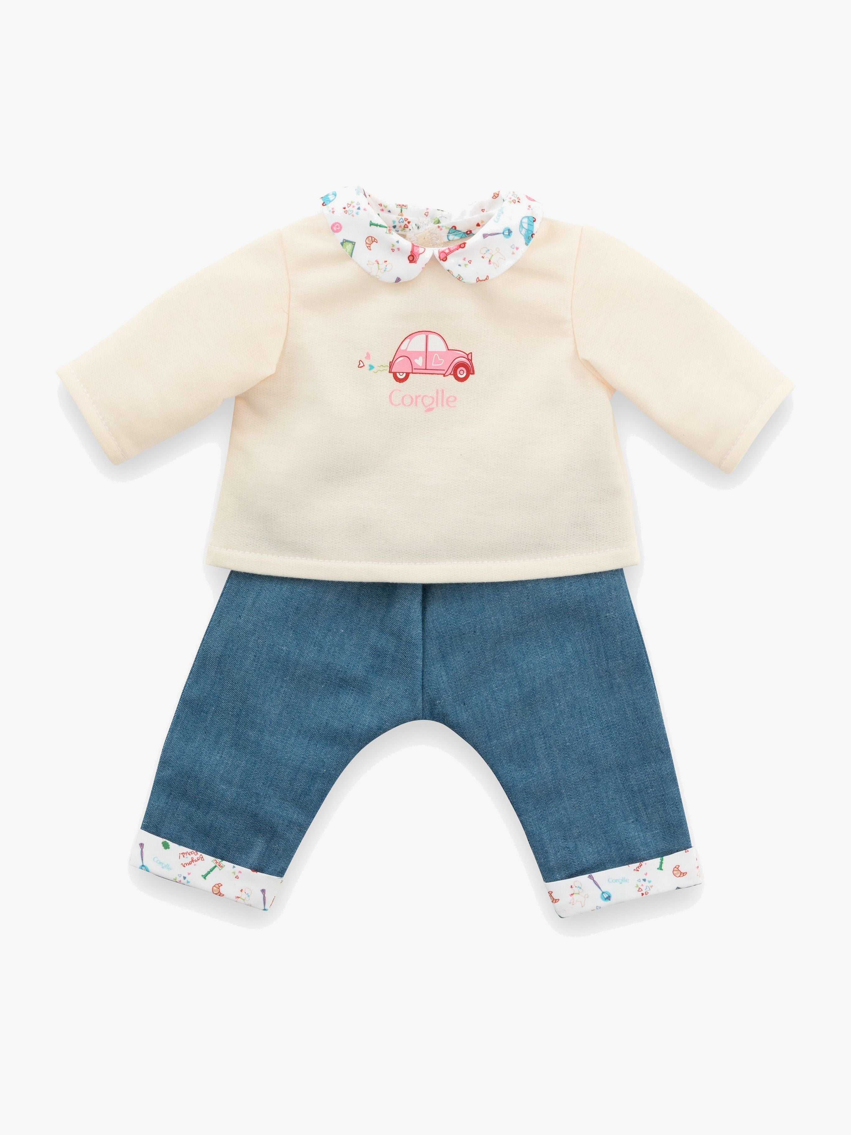 Trøje fra Corolle med medfølgende jeans. Den har et sjovt print og praktisk velcrolukning. Perfekt til masser af fantasifuld leg med dukken. - Velcrolukning. - Flotte detaljer. - Til sjov og fantasifuld rolleleg. - Passer til dukker, der er 30 cm. - CE-mærket. - Anbefalet alder: Fra 1,5 år.