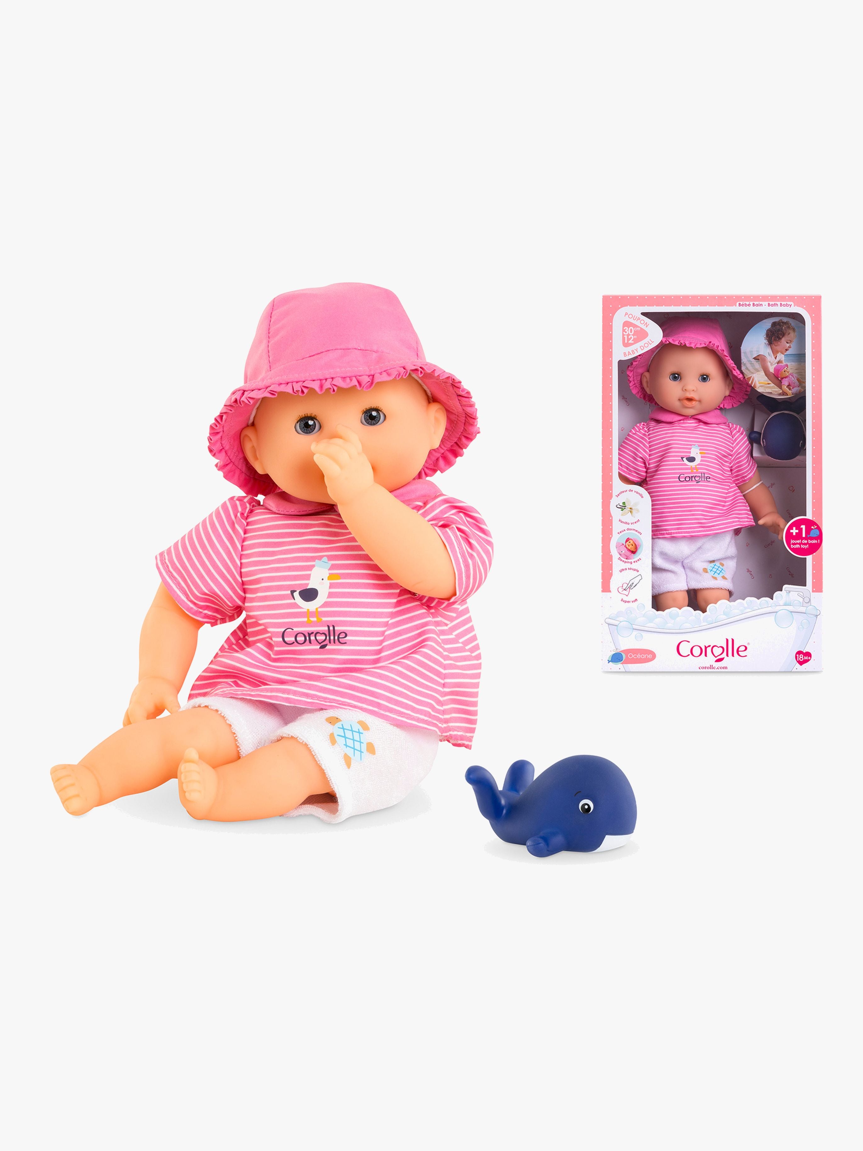 Sød badedukke fra Corolle. Perfekt til timevis af fantasifuld leg. - Dukken kan sidde. - Klædt i sød sweater og shorts med matchende hue. - Sødt og udtryksfuldt ansigt. - Kan lukke øjnene. - Blød krop. - Vaniljeduftende. - Inkluderer: Badelegetøj. - CE-mærket. - Anbefalet alder: Fra 1,5 år. - Plastik, stof.