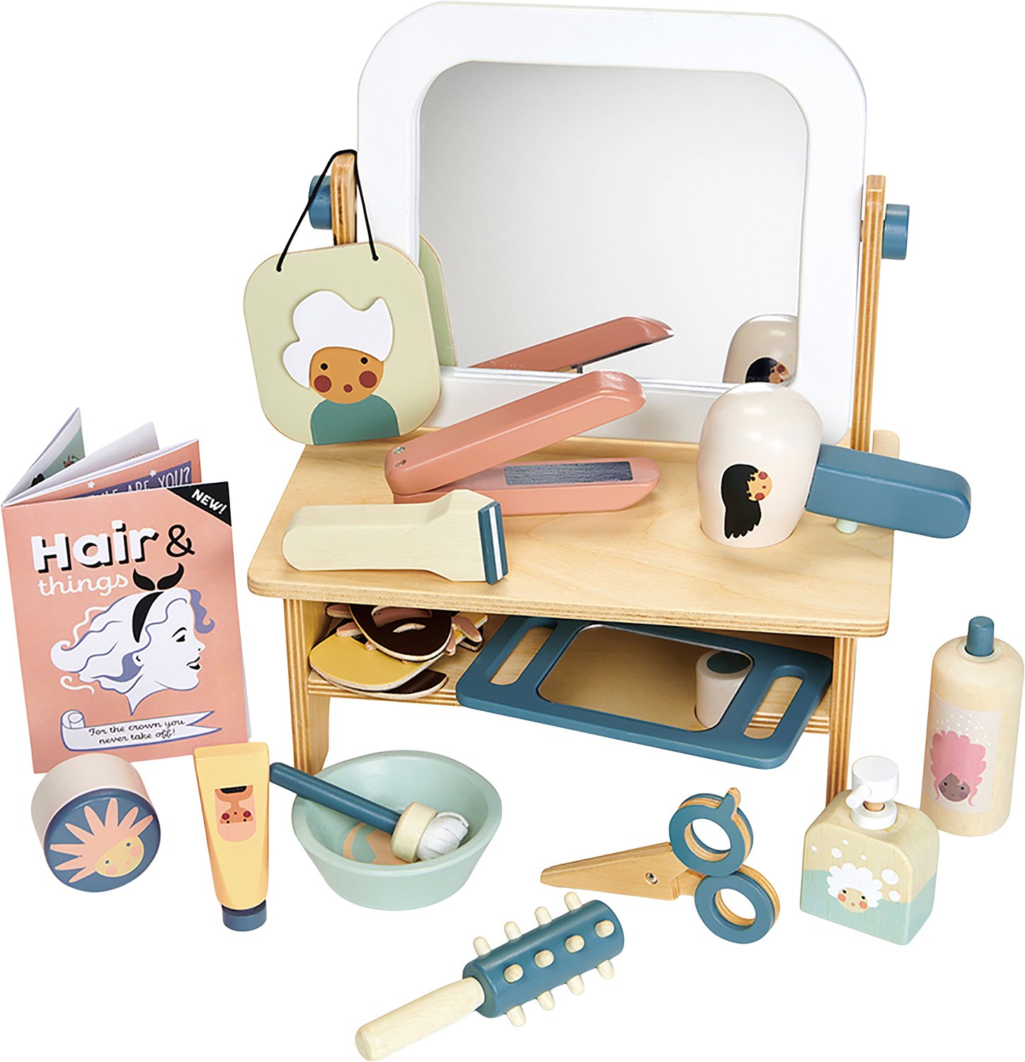 Rolleleg frisørsæt i træ. Denne frisørsalon indeholder et overdådigt udvalg af hårbehandlings- og stylingmuligheder for alle hårtyper, farver og stilarter. Masser af muligheder for fantasiful leg. Et vendespejl med opbevaringshylde og plads til hårtørrere
