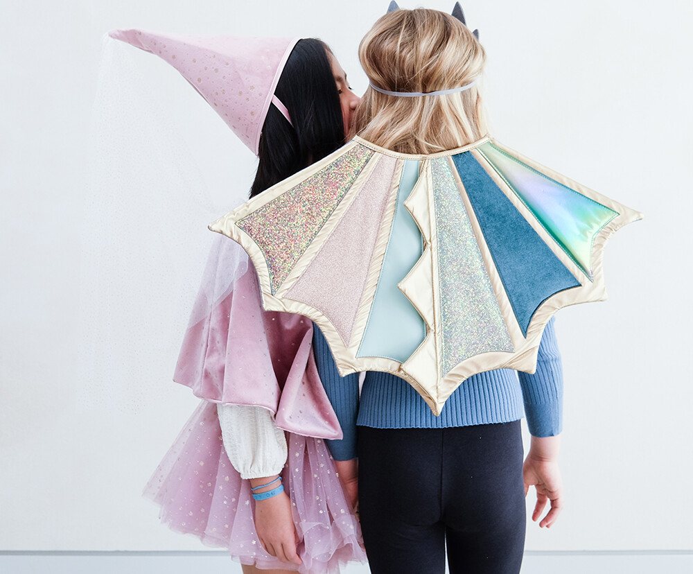 Dragevinger med dramatiske detaljer, elastikstrop, glitter og gyldent kantbånd. Alder: 3-8 år