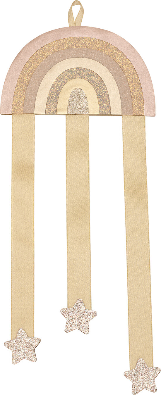 Vægdekoration i form af en stor regnbue i lyserøde nuancer med glitrende detaljer og stjerner. En...