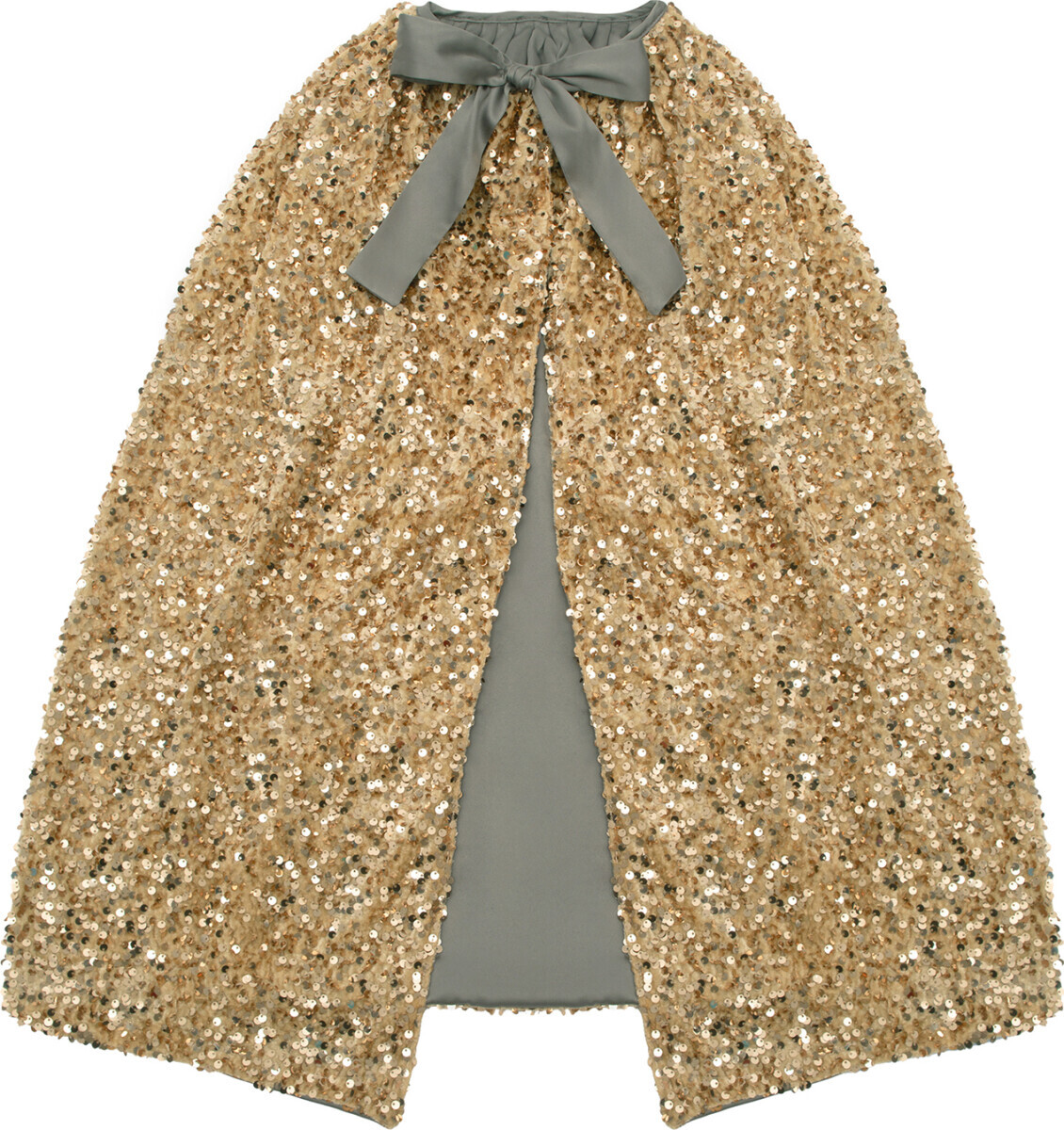 Gylden kappe dekoreret med tusindvis af guldpailletter. Kappen er forsynet med bindebånd i gråt...