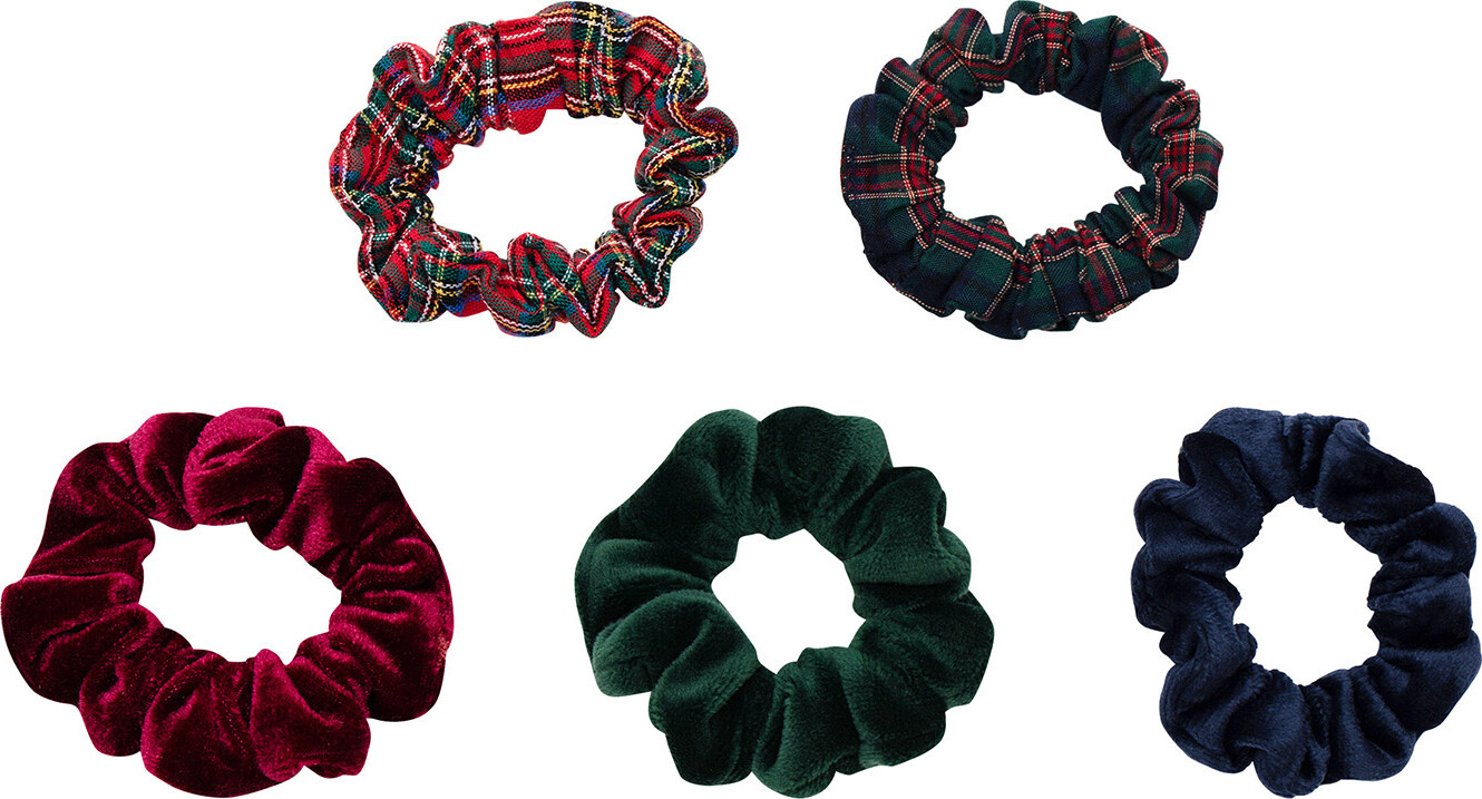 5 scrunchies i skotskternet stof og mørkt velour.Alder: 3-8 år