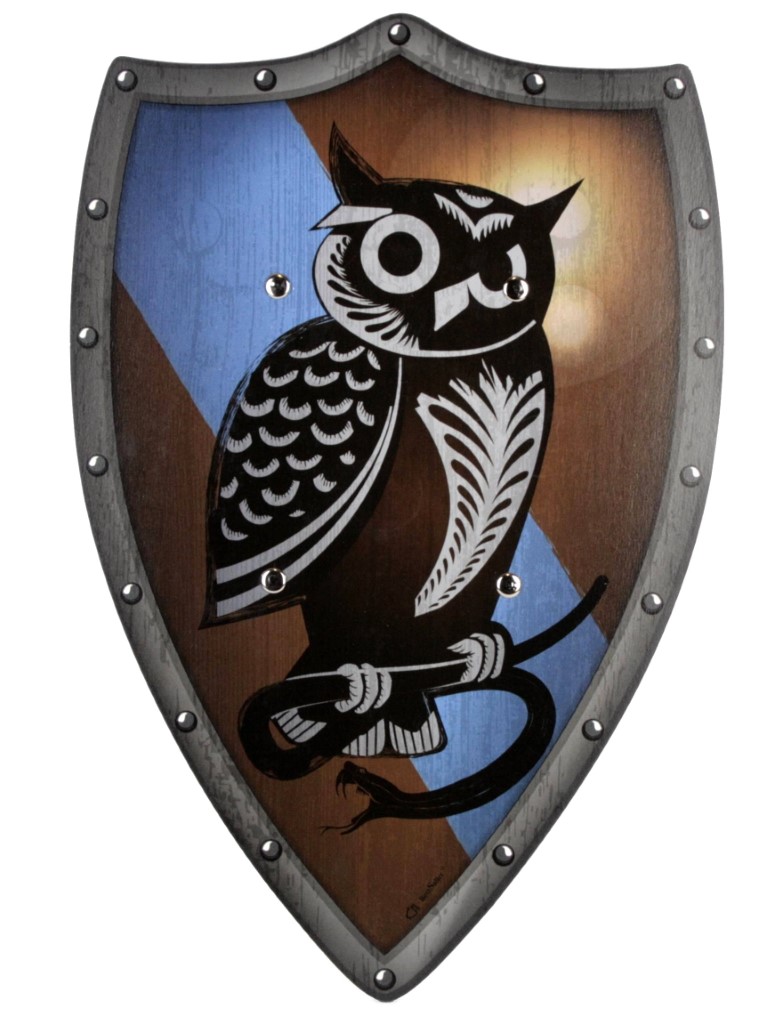 Uglen er ofte benyttet til at demonstrere kløgt. Så ridderne med dette skjold er måske de smarteste på hele krigscenen, så måske de kan planlægge et bagholdsangreb, eller angribe fra flere flanker? Skjold i træ, bag på sidder der 2 læderremme til at hold