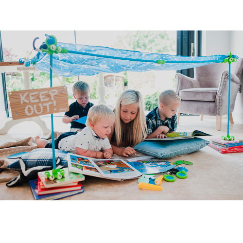 Telt-Kit Super er et telt-kit, der er skabt til store drømme og store bygningsværker. Brug det indenfor og udenfor. I stuen og på børneværelset... ja, selv badeværelset kan bruges som byggegrund, når I har et Telt-Kit Super. Det fleksible og ikke mindst alsidige byggesystem kan bruges på så utrolig mange måder, at I sikkert vil opleve, at jeres barn rejser et nyt telt hver dag.Telt-Kit Super indeholder:8 stænger4 diske3 klemmer3 kroge2 sugekopper2 pløkker6 greb1 Keep Away-skiltDe forskellige elementer, som er indeholdt i Telt-Kit Super, kan bruges til at forankre og fastgøre lagner, tæpper o.lign. Glem derfor alt om gamle dages hulebyggeri, hvor man forsøgte at drapere fire stole med en dug, og så krydsede fingre for, at den ikke ville glide ned hele tiden.Dette telt-kit er skabt til intelligent teltbyggeri. Stole, reoler og borde kan sagtens stadig indgå i byggelegen, men som noget nyt kan dit barn som det letteste i verden, også tage fx vindueskarme og vinduer i brug. Sidstnævnte gøres ved at bruge de medfølgende sugekopper, som placeres på vinduerne, hvorefter lagnet sættes fast. Det særlige ved dette telt-kit er desuden, at der medfølger diske og stænger, som kan bruges til at bygge et telt-skelet, således at teltet er lidt mere stabilt fra start af. På den måde minder dette telt-kit meget om et almindeligt telt - med den forskel, at dette telt jo kan varieres i det uendelige.Prøv fx også at bruge noget meget mørkt stof som teltdug - det vil være en sjov oplevelse for dit barn at krybe ind i mørket og putte sig derinde. Det vil også være en oplagt måde at bruge teltet på, hvis det har været en lidt hård uge, og dit barn trænger til lidt ro og fordybelse.Har I nogle smukke og farverige tørklæder, kan I bygge et beduinertelt, og fylde det med store puder. I kan lave en læsehule, et sejlskib, et picnic-telt, en ubåd... mulighederne er så uendelig mange. Og når det er tid til at pakke sammen, kan I glæde jer over, at kittet kun fylder ganske lidt. Om sommeren vil de desuden være oplagt at bruge telt-kittet som et lille skygge-skjul, hvor børnene kan krybe ind og hygge sig, når solens stråler bliver lidt for skrappe. Telt-Kit Super kan bruges af børn fra 3 år (dog med hjælp fra forældre) og på egen hånd fra ca. 6 år.