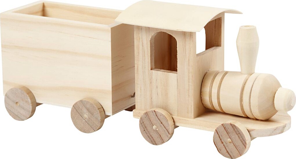 Lille tog i lyst træ, som via en øsken er sammenkoblet med en vogn (ekstra vogn 57978 kan tilføjes). Toget og vognen kan du fx dekorere med Plus Color hobbymaling, elbrænder eller decoupage. Brug...