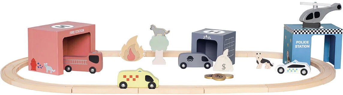 Togbane fra JaBaDaBaDo i træ med fem transportmidler. Den har en politistation og et fængsel. Togbanen har en brandstation og en brand, der skal slukkes. Perfekt til leg, hvor det kun er fantasien, der sætter grænser. CE-mærket. Kan samles med andre Jabadabado racer- og togbaner. Indeholder: 15 vejdele, 1 brandbil, 1 ambulance, 1 bil, 1 politibil, 1 helikopter, 1 brandstation, 1 politistation, 1 fængsel, 2 træer, 1 kat, 1 brand, 3 mønter. Anbefalet alder: Fra 2 år.