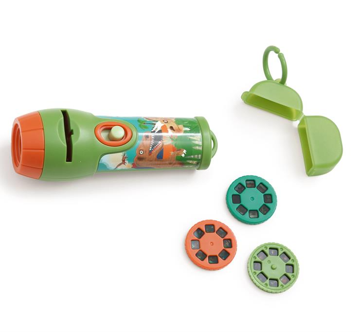 Skiver med diasbilleder forvandler lommelygten til en projekter, hvor dit barn kan lyse billeder op på væggen. Skift billedet ved at dreje på kanten af skiven. Man stiller skarpt ved at dreje yderst på lommelygten. Perfekt til små dinosaur-nørder. Eller bare som en sjov lommelygte til dit nysgerrige barn, som lærer at forstå, at billedet kan stilles skarpt og blive uskarpt igen, hvis lommelygten først peges mod væggen og så mod loftet. God til huleleg, soveaftaler, til fordybelse ved puttetid, og den kan også bruges til at fortælle og lære om dinosaurerne.Med 3 diasskiver og praktisk boks til opbevaring.