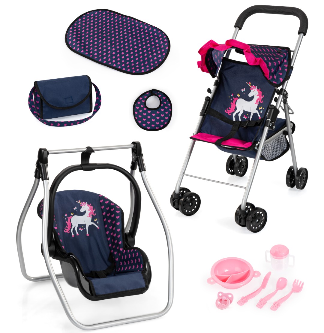 Dette dukke klapvognssæt er det perfekte startsæt til små dukkemødre og -fædre. Det består af en dukkeklapvogn, en skuldertaske, en tallerken med bestik, en drikkekop, en hagesmæk og en puslemåtte. Takket være de dobbelte hjul og det bløde håndtag er klap