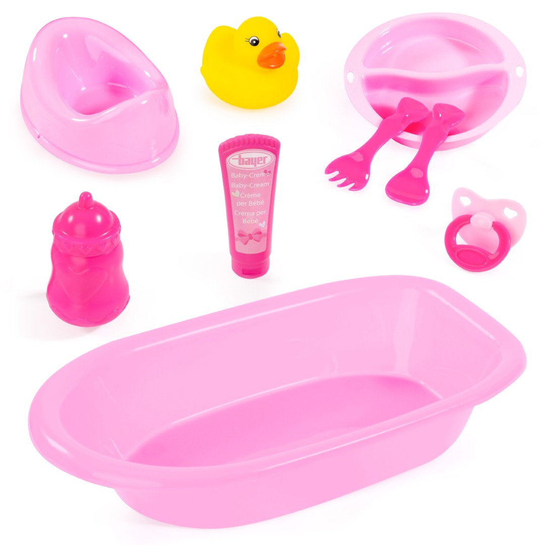 Det er tid til at give din dukke bad. Med den sjove gummiand vil dit barn have det rigtig sjovt. Et badekar, gummiand, potte, flasker, sut og plastikservice er inkluderet. Produktmål (cm): 44,5 x 22,5 x 8,6 Størrelse: 44,5 x 22,5 x 8,6 cm Alder: Fra 18 må