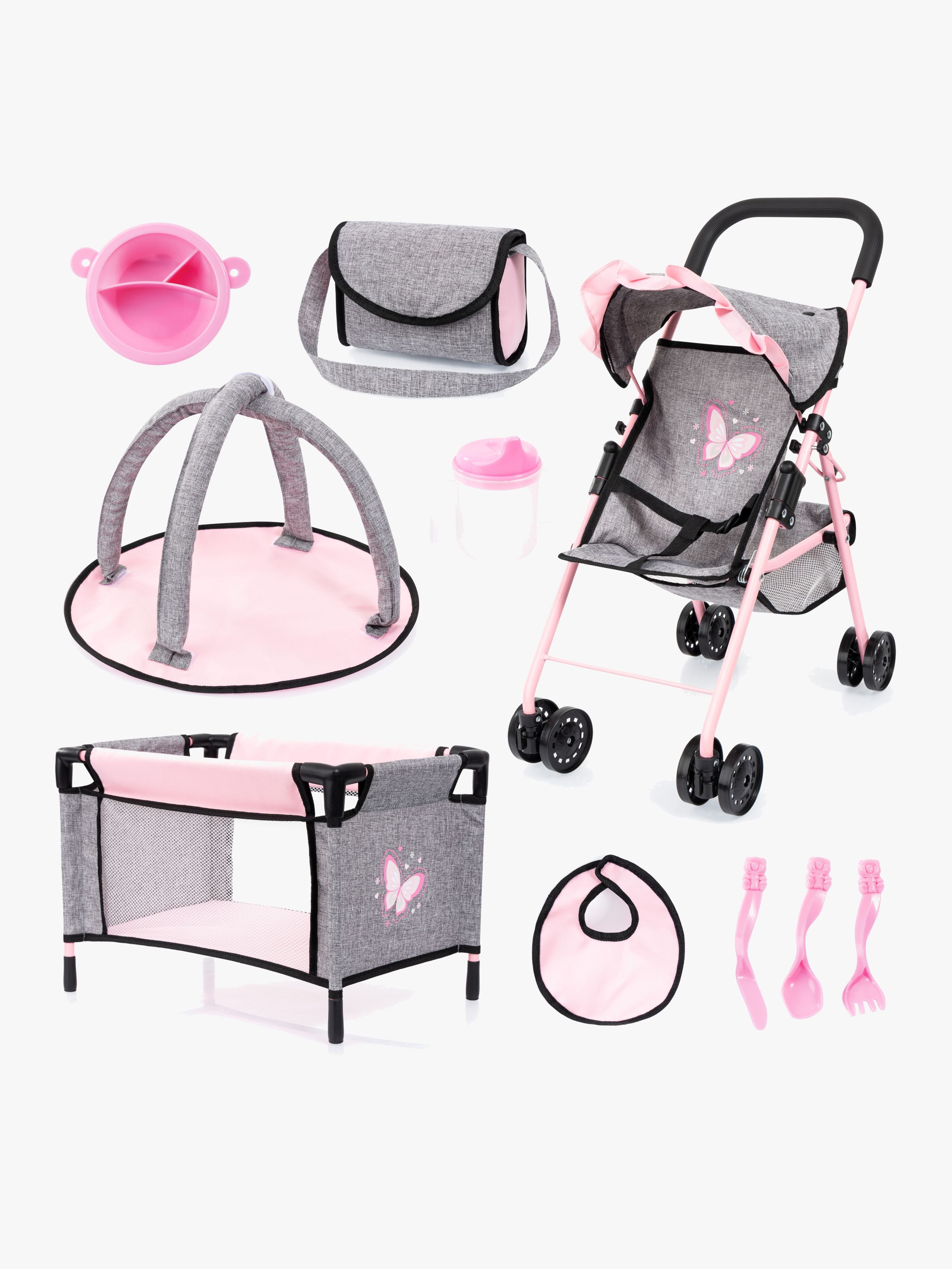 Bayer Design 10-i-1 Dukkevogn Sæt, Grå/Lyserød