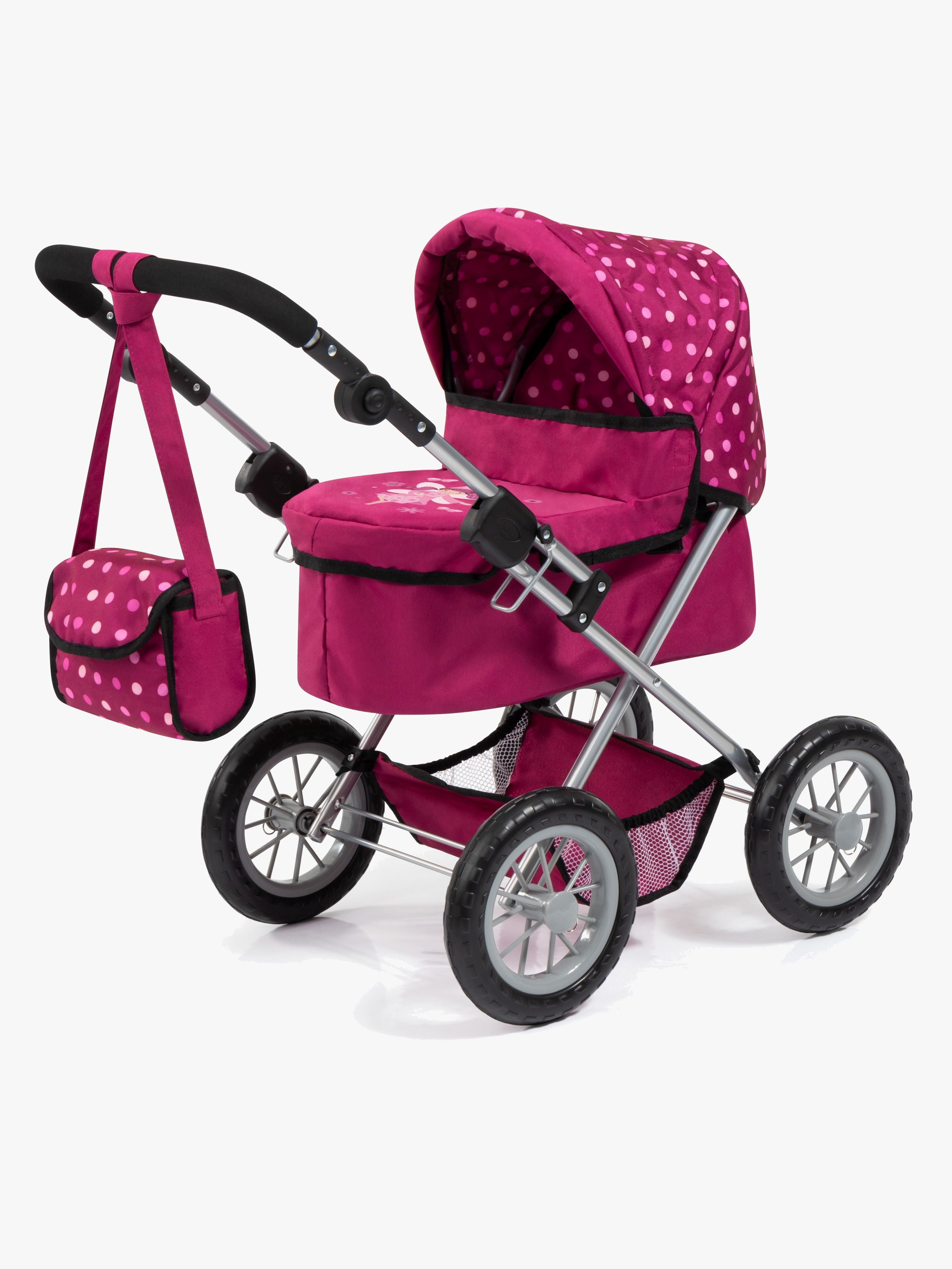 Giv dit barn timevis af fantasifuld leg med den smukke Bayer Design Dukkevogn Trendy i en elegant bordeaux farve. Denne sammenfoldelige dukkevogn er designet med et charmerende hjertemønster, der tilføjer et stilfuldt præg til legestunden. Med et justerbart håndtag, der passer til børn i forskellige højder, og store hjul, er det nemt at manøvrere dukkevognen både indendørs og udendørs.