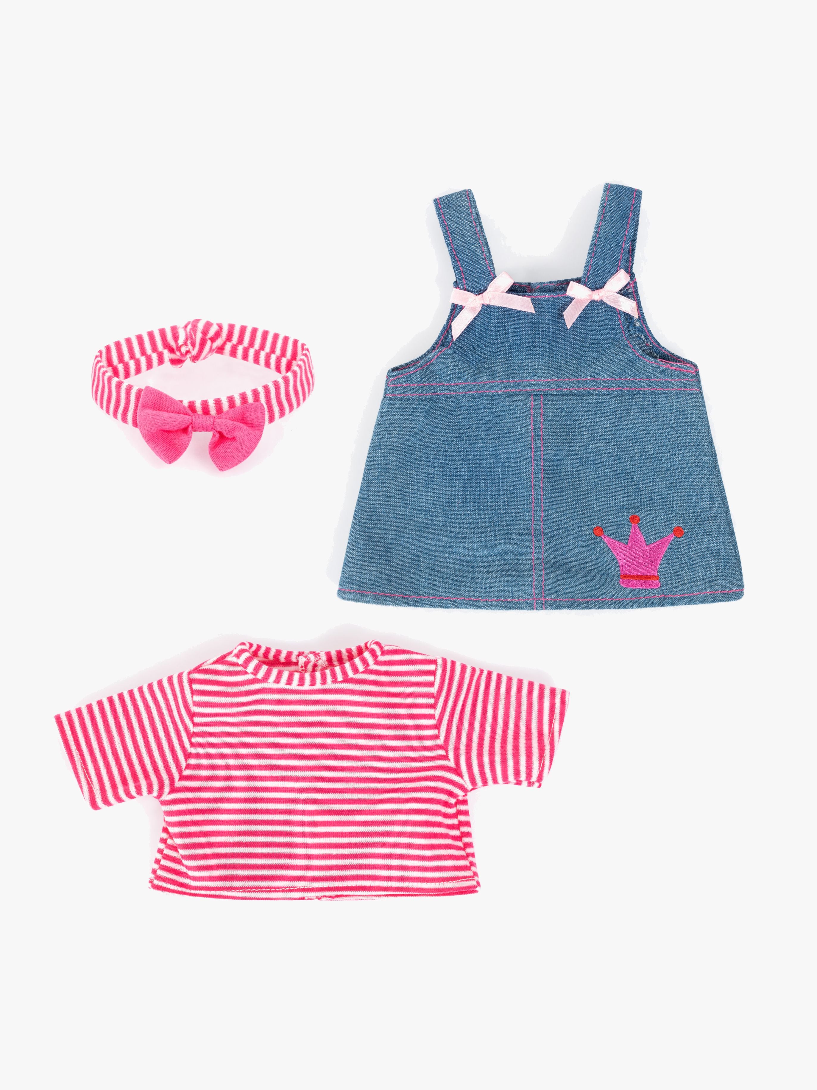 Dette Bayer Design Dukketøj produkt er designet til at inspirere til timevis af fantasifuld leg. Sættet inkluderer tre dele, der sammen skaber et stilfuldt outfit til dukker mellem 38 og 42 cm. Med en charmerende cowboykjole udsmykket med pink sløjfer og et indbydende kronemotiv, samt en stribet rød T-shirt med korte ærmer og et matchende hårbånd, vil dette tøj helt sikkert blive en favorit blandt børn.