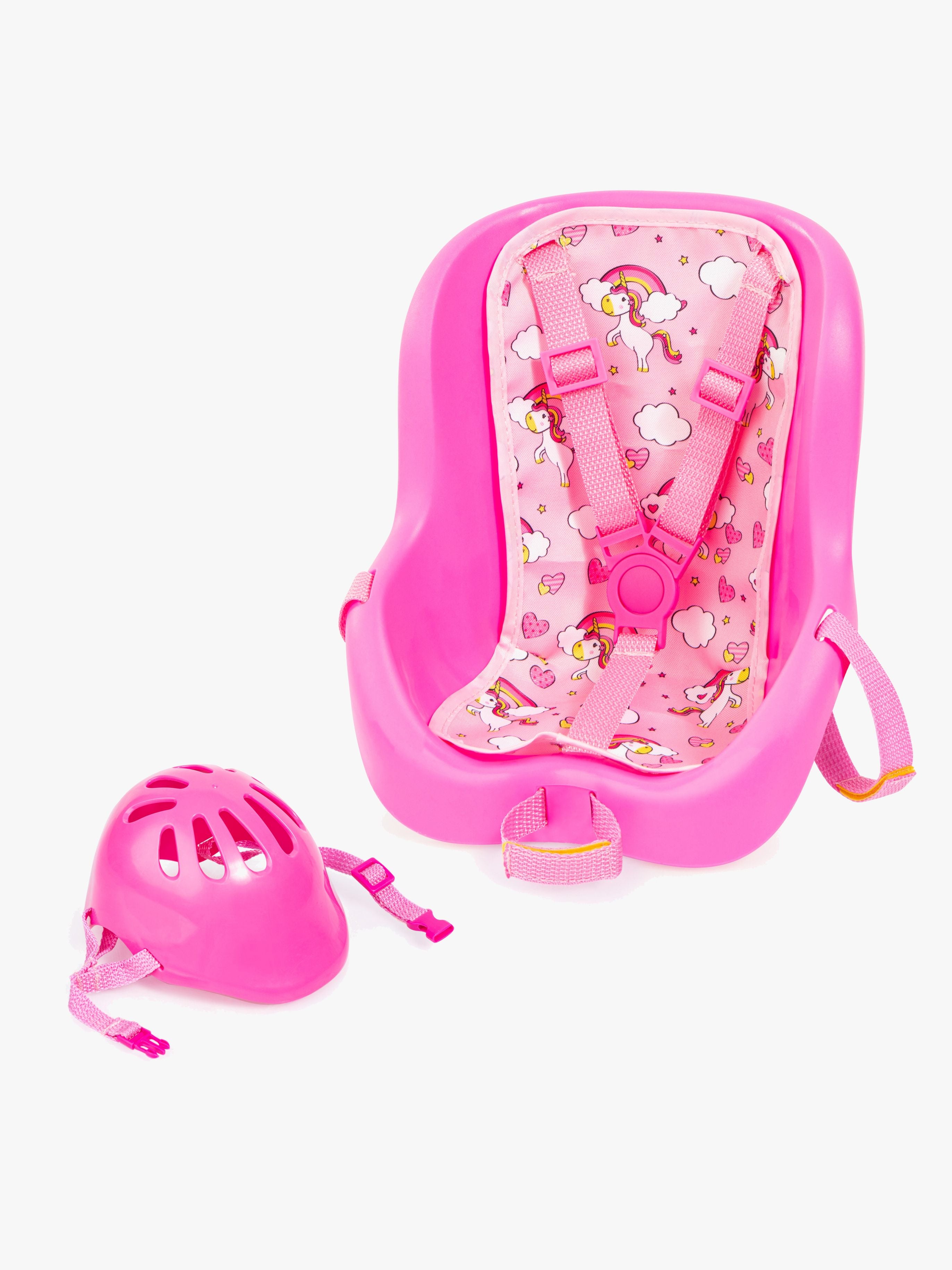 Giv dit barn en fantastisk legeoplevelse med Bayer Design Cykelstolen med Hjelm. Denne cykelstol er designet med et charmerende hjertemønster og et farverigt enhjørningemotiv, der fremmer fantasifuld leg i timevis. Cykelstolen er ikke kun sjov, men også sikker med justerbare sikkerhedsseler, så dukkerne sidder trygt og godt.