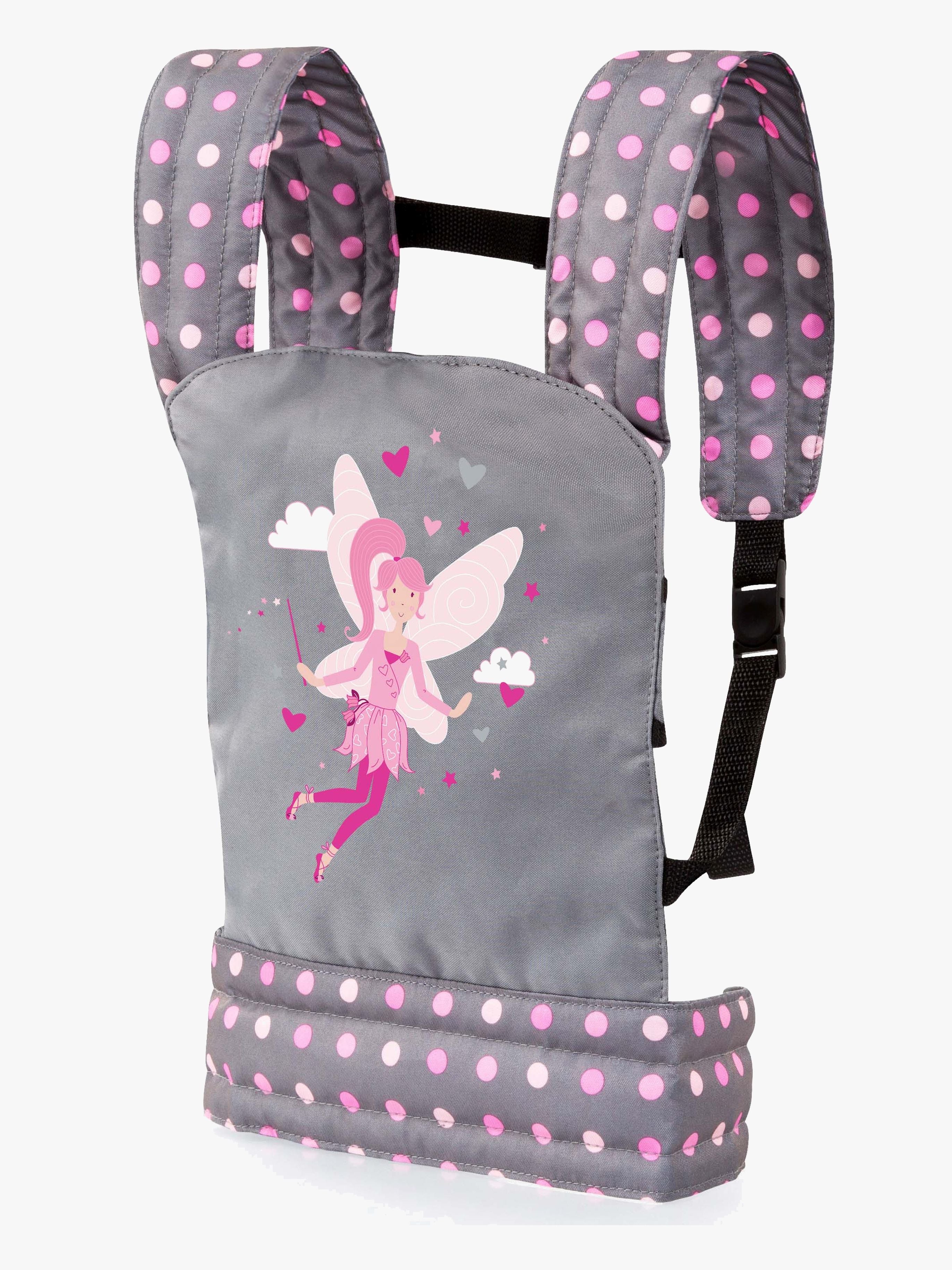 Dukkebæreselen sidder behageligt takket være de polstrede skulderstropper og det justerbare taljebånd. Den kan bæres både på maven og ryggen, hvilket giver mulighed for alsidig brug og gør det nemt for dit barn at tage sin dukke eller tøjbamse med sig.