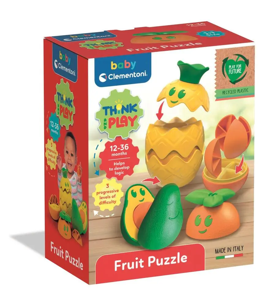 Tre meget farverige frugter lavet af genbrugsplastik. De hjælper med at finpudse logisk tænkning hos små børn! Et raffineret "Made in Italy"-design til et bæredygtigt spil af høj kvalitet.