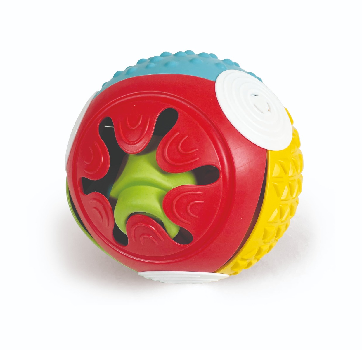Lækker bold med mange forskellige sanseindtryk for dit lille barn. På overfladen er der forskellige felter med riller og dutter, og inden i er bolden hul. Dit barn kan putte de 5 klodser ind og tage dem ud igen, og den slags igen-igen lege bliver små børn aldrig trætte af. Clemmy er en serie af særlig baby-egnet legetøj fra italienske Clementoni, fremstillet af Franpene. Dette særlige materiale kan tåle vask ved 70 grader i opvaskemaskine, og det er godkendt til babyers måde at lege på. Det foregår ofte ved at gumle og sutte på legetøjet, og det kan dit barn gøre med Clemmy helt uden risiko. Franpene er ikke tilsat duft, men det afgiver selv en svag duft, som aftager med tiden. Den er naturligvis ganske ufarlig for dit barn.