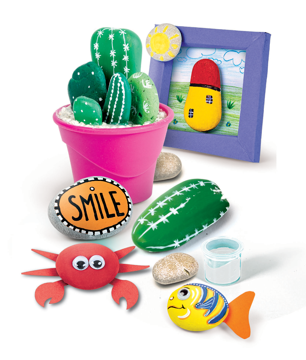 Komplet sæt til at lave kunstværker på sten. Æsken indeholder: 5 flade sten6 tempera-farver8 sjove øjnePenselLykkehjul med forslag til forskellige motiverBæger til at have maling i