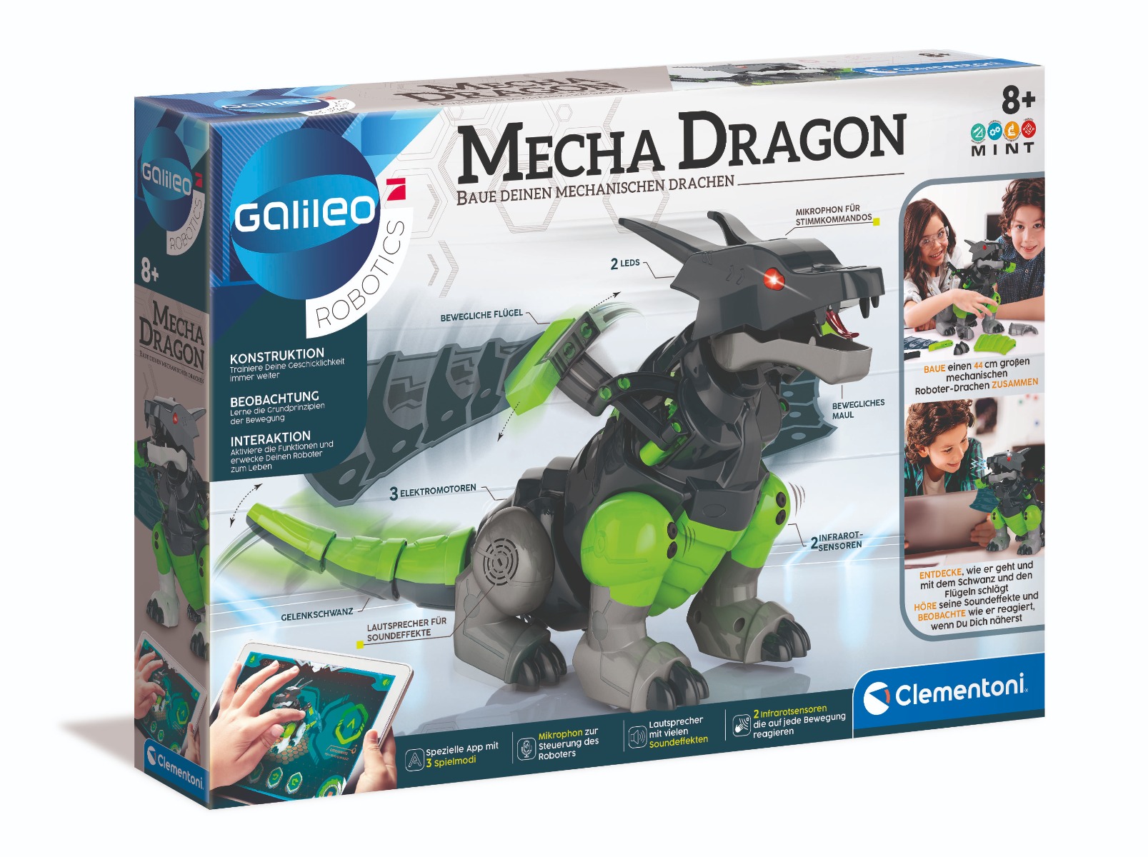 Byg en flot drage, som kan gå, vifte med halen og baske med vingerne. Næsten som at have sin egen drage som kæledyr.Dragen bliver 44 cm stor, når den er færdigbygget ud af de 96 dele. De består bl.a. af 2 infrarøde sensorer, som benytter højfrekvente signaler, og 3 elektriske motorer. Download en gratis app, som lader dig programmere små opgavesekvenser til dragen, eller brug den til et interaktivt spil.
