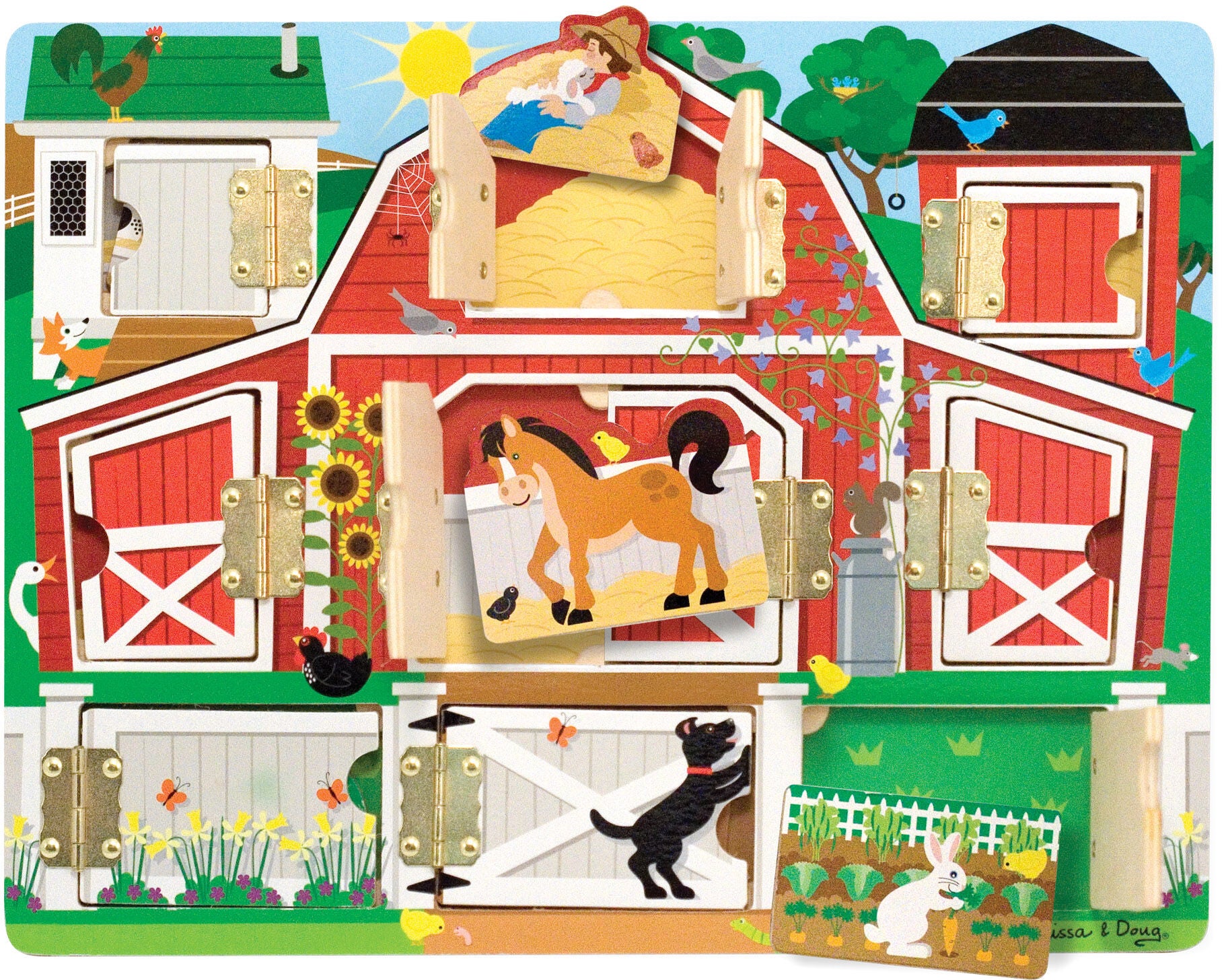 Melissa & Doug Bondegård m. Låger - et herligt billede med forskellige låger dit barn kan åbne og lukke. Bagved de 9 låger gemmer der sig fine forskellige dyr. Spillet hjælper dit barn med at udvilke sin finmotorik. Materiale: Træ og metal (lågerne) Anbefalet alder: Fra 3 år.