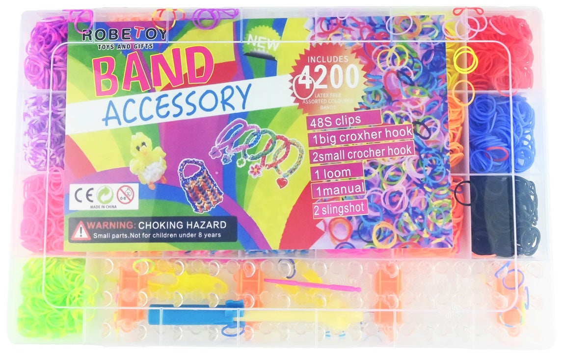 Farverigt armbåndssæt fra Robetoy med 4200 farverige loombånd. Perfekt til kreative stunder. - Indeholder: 4200 loombånd, 1 opbevaringskasse, 48 klips, 1 stor loom-krog, 2 små loom-kroge, 2 Y-kroge, 1 brugsanvisning. - Lav dine egne smukke armbånd. - Farverigt design. - CE-mærket. - Anbefalet alder: Fra 8 år. - Plastik, gummi.