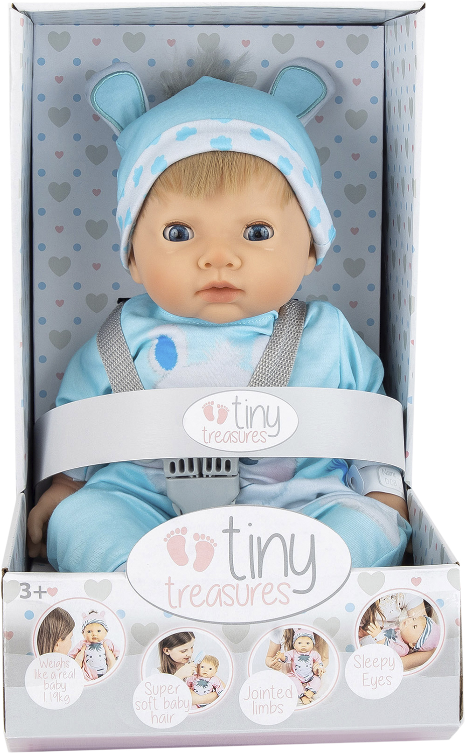 Tiny Treasures dukke med blond hår og et nuttet blåt outfit med flodhest. Dukkken både ligner og føles som en rigtig baby. 45 cm - 1255g.