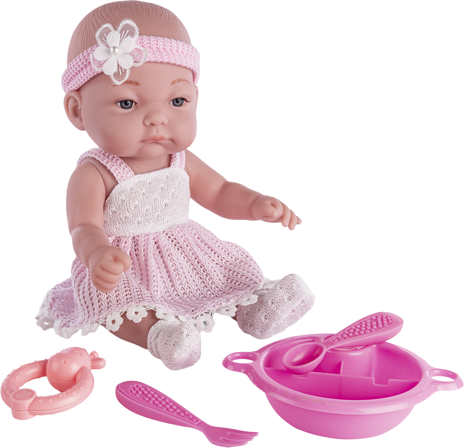 Mathilde dukke med ansigtsudtryk, strikket tøj og tilbehør. 30 cm livagtig dukke med blød krop, flot babytøj og tilbehør.